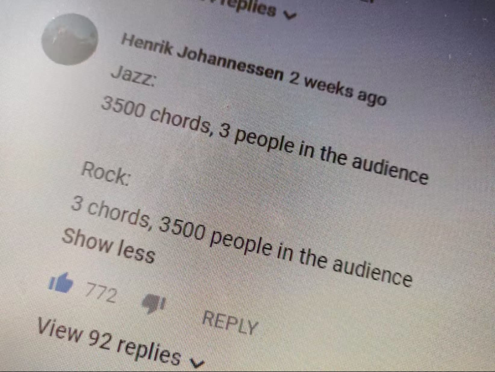 A social media post discussing the contrast between a jazz performance with 3500 chords and 3 people in the audience versus a rock performance with 3 chords and 3500 people in the audience. (Captioned by AI)