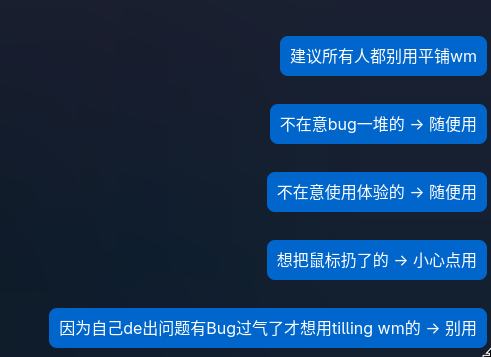 有奇怪软件要用/游戏狂 → 别用,有时候一个窗口,比如wine模拟出来的软件会不走tilling wm的规则的,然后窗口就会乱飞或者卡死什么的,你就得自己解决啦~
